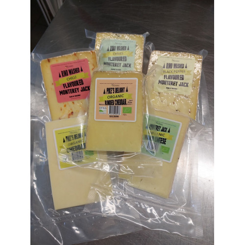 Cheese selection pack containing both our medium and mature cheddars, Monterey Jack along with the three flavoured Monterey Jacks (Chilli, Chive and Black Pepper).